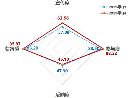 4、從維度來看,反響度有所下降,獲得感明顯提升。第四季度,宣傳度得分63.56,參與度得分88.32,反響度得分46.10,獲得感得分85.87。