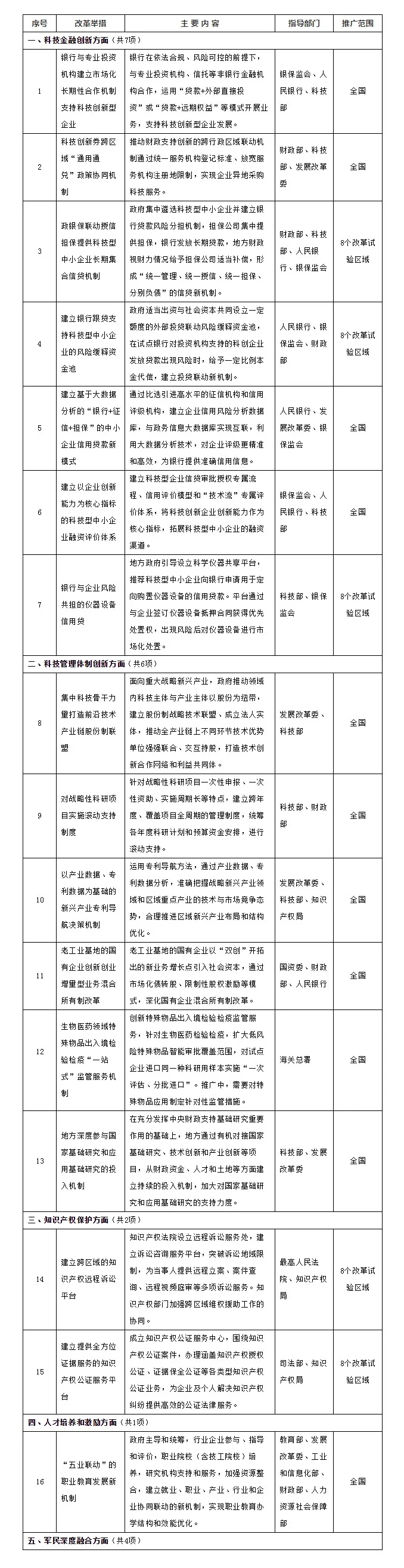 本次正式發(fā)布的20項改革舉措,是繼2017年首批13項、2018年第二批23項之后,由國辦發(fā)布的第3批向全國或在8個試驗區(qū)域范圍內(nèi)復制推廣、支持創(chuàng)新的改革舉措,涵蓋了科技金融創(chuàng)新、科技管理體制創(chuàng)新、知識產(chǎn)權(quán)保護、人才培養(yǎng)和激勵和軍民深度融合5個重點領(lǐng)域。根據(jù)我們觀察分析,經(jīng)過了前期的沉淀,以及進一步的實踐探索,改革進一步走向“深處”和“實處”,這批舉措緊密呼應當前中央的重要改革關(guān)切,充分體現(xiàn)了“實”和“新”,在一些改革的“老大難”問題上進一步破題。