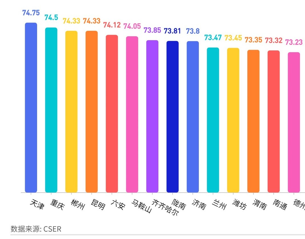前15名分別是:天津、重慶、郴州、昆明、六安、馬鞍山、齊齊哈爾、隴南、濟(jì)南、蘭州、濰坊、渭南、南通、德州、西安。