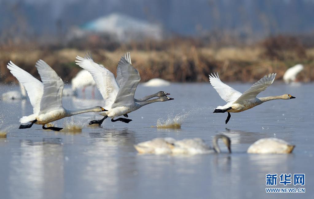 候鳥在位于江西鄱陽湖畔的五星農場境內振翅起飛(2018年1月11日攝)。新華社記者 萬象 攝