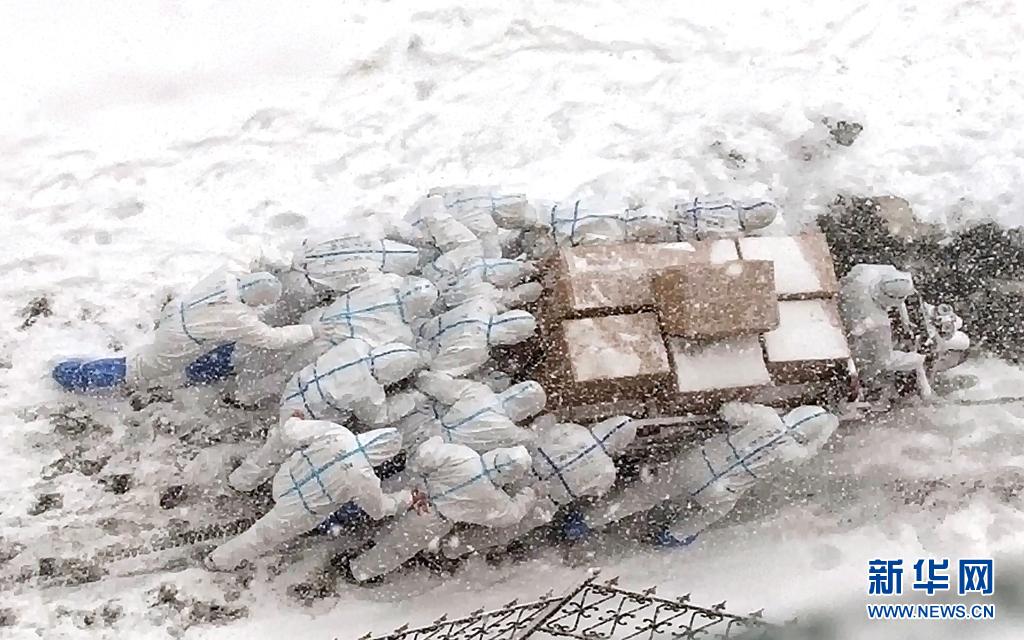 漫天飛雪的路上,十幾個人推著一輛滿載貨物的三輪車艱難前行,數次滑倒又爬起后,身上的防護服仿佛與天地融為一體……