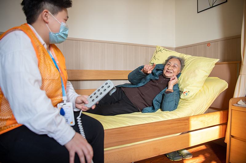 2021年12月2日,在重慶市渝北區(qū)仙桃街道養(yǎng)老服務(wù)中心,陳佩蘭老人(右)在護理員陳傲的幫助下體驗使用“智能護理床”。新華社記者 唐奕 攝