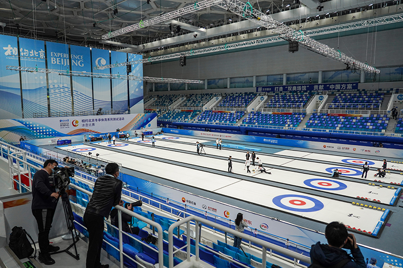 2021年4月6日,運動員在冰壺項目測試活動中。2022年北京冬奧會將國家游泳中心“水立方”改造為“冰立方”,用作冰壺項目比賽場館,有效減少建設(shè)投資,更讓夏奧場館煥然新生,拓展多元賽后經(jīng)營能力。新華社記者 彭子洋 攝