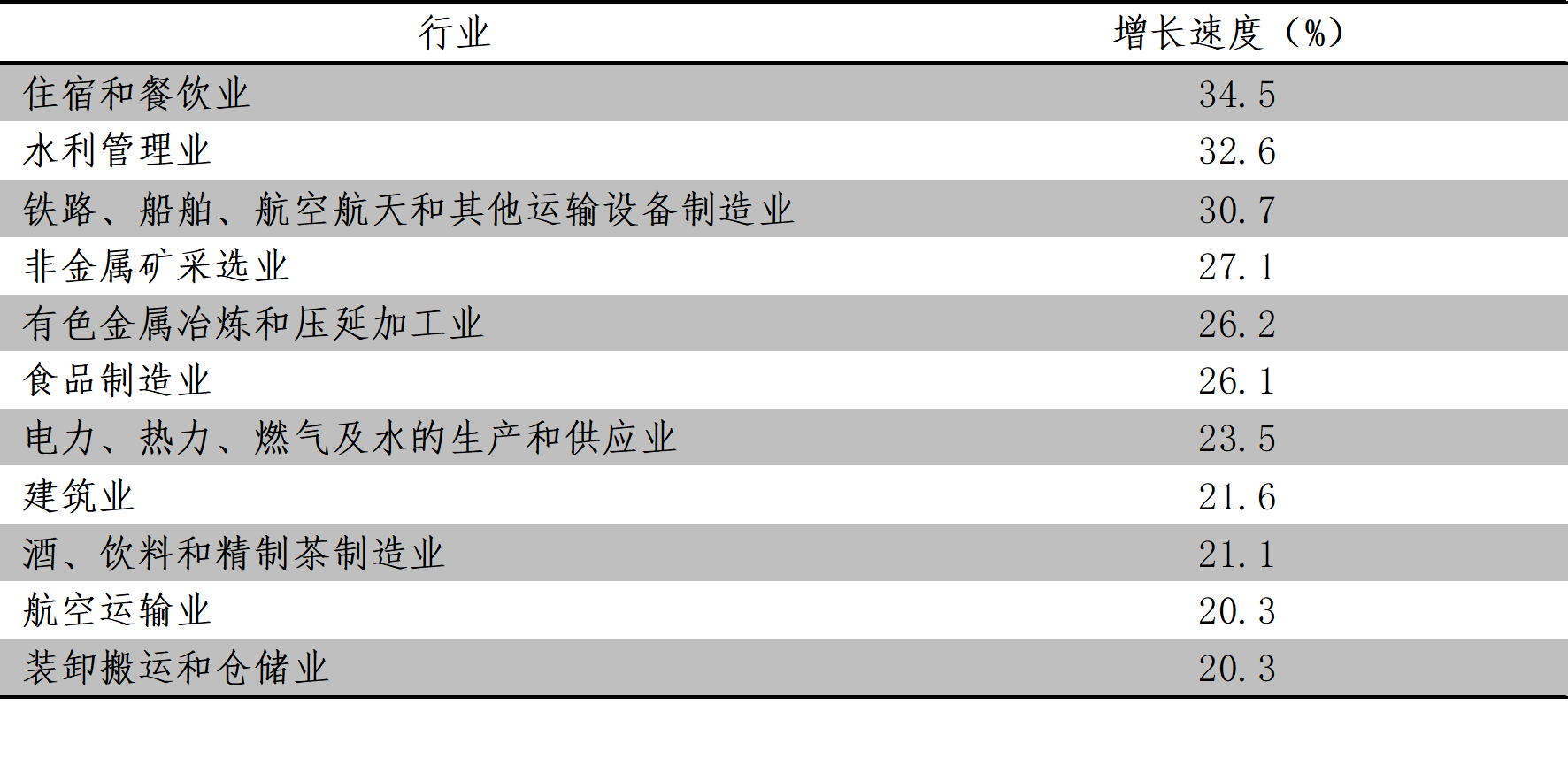 1-8月份,固定資產(chǎn)投資增速超過(guò)20%的行業(yè)共11個(gè),即住宿和餐飲業(yè)增長(zhǎng)34.5%,水利管理業(yè)增長(zhǎng)32.6%,鐵路、船舶、航空航天和其他運(yùn)輸設(shè)備制造業(yè)增長(zhǎng)30.7%,非金屬礦采選業(yè)增長(zhǎng)27.1%,有色金屬冶煉和壓延加工業(yè)增長(zhǎng)26.2%,食品制造業(yè)增長(zhǎng)26.1%,電力、熱力、燃?xì)饧八纳a(chǎn)和供應(yīng)業(yè)增長(zhǎng)23.5%,建筑業(yè)增長(zhǎng)21.6%,酒、飲料和精制茶制造業(yè)增長(zhǎng)21.1%,航空運(yùn)輸業(yè)增長(zhǎng)20.3%,裝卸搬運(yùn)和倉(cāng)儲(chǔ)業(yè)增長(zhǎng)20.3%。
