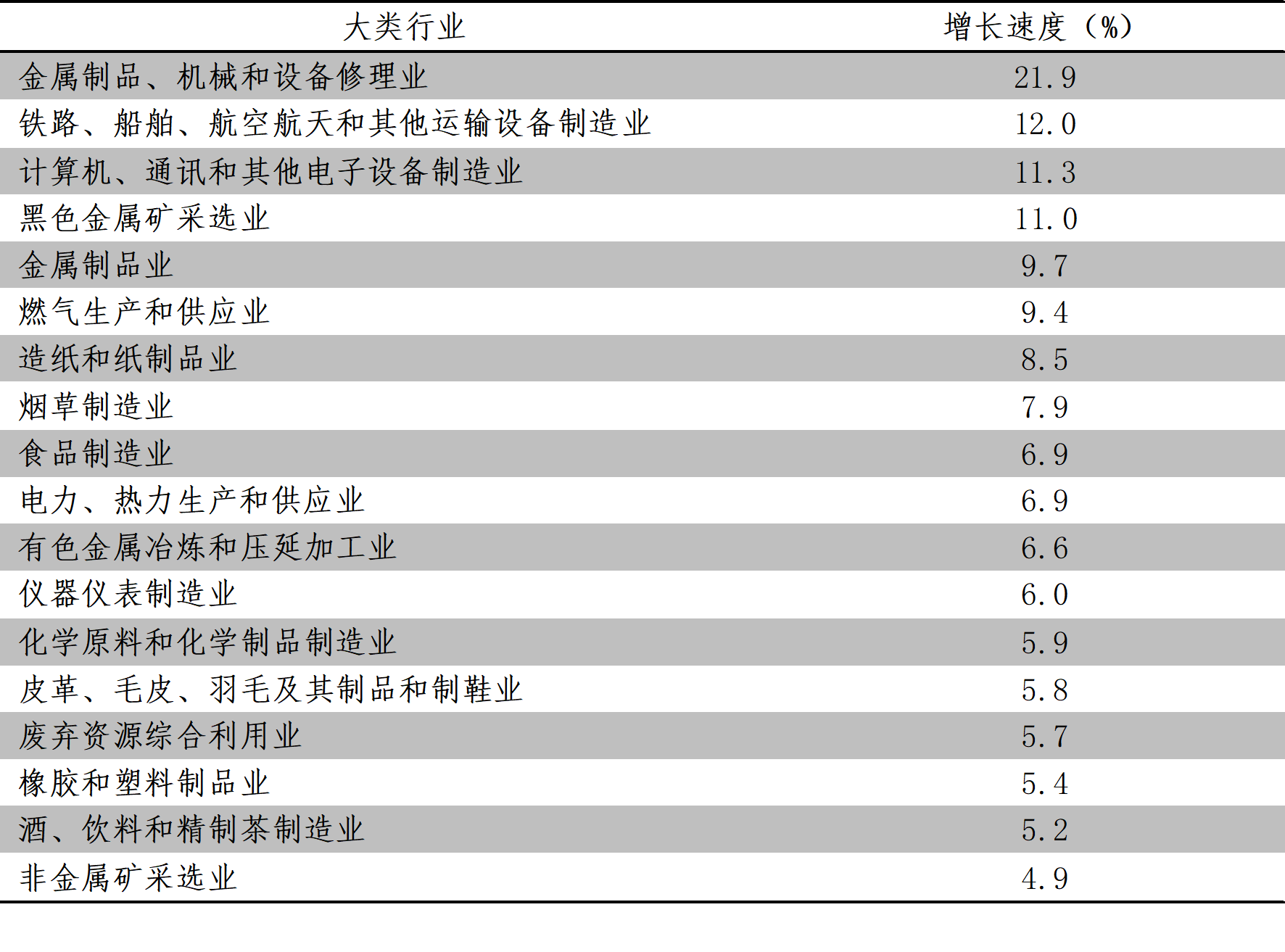 8月份,增長(zhǎng)速度超過(guò)規(guī)模以上工業(yè)增長(zhǎng)4.5%的主要大類行業(yè)共有18個(gè),即金屬制品、機(jī)械和設(shè)備修理業(yè)同比增長(zhǎng)21.9%,鐵路、船舶、航空航天和其他運(yùn)輸設(shè)備制造業(yè)增長(zhǎng)12.0%,計(jì)算機(jī)、通訊和其他電子設(shè)備制造業(yè)增長(zhǎng)11.3%,黑色金屬礦采選業(yè)增長(zhǎng)11.0%,金屬制品業(yè)增長(zhǎng)9.7%,燃?xì)馍a(chǎn)和供應(yīng)業(yè)增長(zhǎng)9.4%,造紙和紙制品業(yè)增長(zhǎng)8.5%,煙草制造業(yè)增長(zhǎng)7.9%,食品制造業(yè)增長(zhǎng)6.9%,電力、熱力生產(chǎn)和供應(yīng)業(yè)增長(zhǎng)6.9%,有色金屬冶煉和壓延加工業(yè)增長(zhǎng)6.6%,儀器儀表制造業(yè)增長(zhǎng)6.0%,化學(xué)原料和化學(xué)制品制造業(yè)增長(zhǎng)5.9%,皮革、毛皮、羽毛及其制品和制鞋業(yè)增長(zhǎng)5.8%,廢棄資源綜合利用業(yè)增長(zhǎng)5.7%,橡膠和塑料制品業(yè)增長(zhǎng)5.4%,酒飲料和精制茶制造業(yè)增長(zhǎng)百分之5.2%,非金屬礦采選業(yè)增長(zhǎng)4.9%。