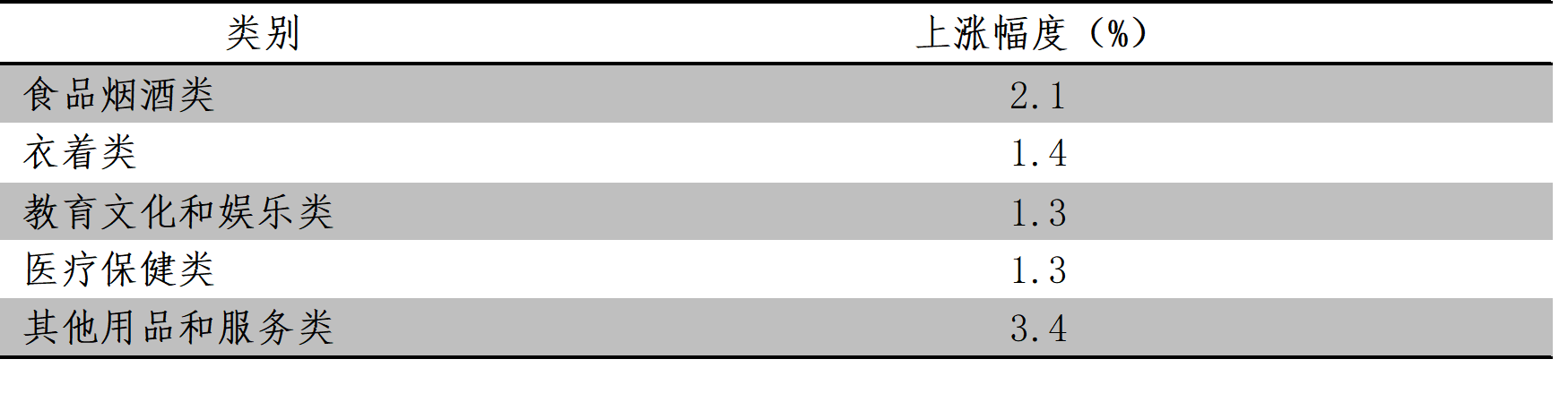 漲幅超過(guò)CPI同比上漲0.6%的類別共有5類,即食品煙酒類價(jià)格同比上漲2.1%,衣著類上漲1.4%,教育文化和娛樂類上漲1.3%,醫(yī)療保健類上漲1.3%,其他用品和服務(wù)類上漲3.4%。
