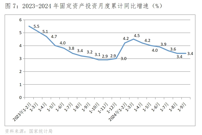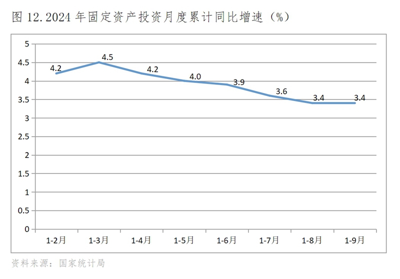 (二)投資增速持續(xù)回落更為明顯,9月份保持穩(wěn)定。1-2月份固定資產(chǎn)投資同比增長(zhǎng)4.2%,1-3月份增速回升到今年以來(lái)的最高增速的4.5%,自此以后持續(xù)回落,到8月份回落到3.4%,9月份保持穩(wěn)定,與8月份增速持平。