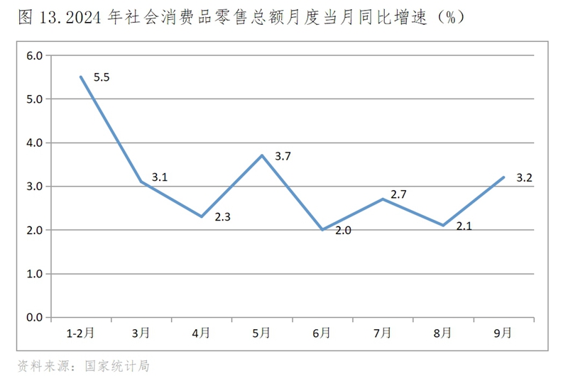 (三)零售增速總體呈現(xiàn)低速波動(dòng)回落,9月份回升。1-2月份社會(huì)消費(fèi)品零售總額同比增長(zhǎng)5.5%,為今年以來(lái)的最快增速,3月份回落到增長(zhǎng)3.1%,此后增速在2.0-4.0%區(qū)間內(nèi)低速波動(dòng),9月份增速回升,增長(zhǎng)3.2%。