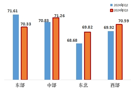 從四大區(qū)域來(lái)看,東部、中部、東北、西部地區(qū)分別為70.33、71.26、69.82、70.59,排名分別為中部第一,西部第二,東部第三,東北第四。與上一季度相比,中部、東北、西部地區(qū)改革熱度指數(shù)提升。同比來(lái)看,四大區(qū)域均呈現(xiàn)上升趨勢(shì),東北地區(qū)增幅最大。