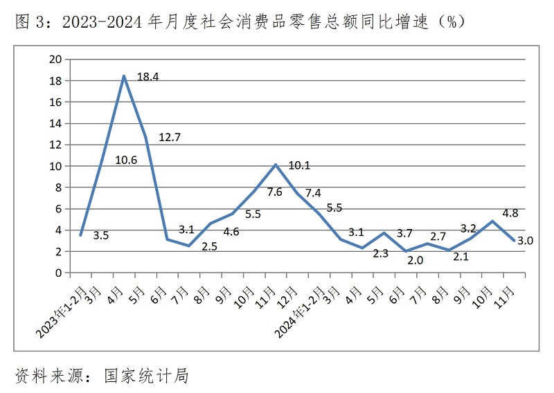 (一)零售增速由升轉落。11月份,社會消費品零售總額同比增長3.0%,比10月份增長4.8%回落1.8個百分點,而10月份增速比9月份增速3.2%回升了1.6個百分點。但受消費品以舊換新政策措施的持續(xù)作用,家用電器和音像器材和汽車銷售仍保持較快增長,11月份限額以上企業(yè)家用電器和音像器材零售額繼續(xù)保持調整增長22.2%,已連續(xù)3個月保持兩位數增長;汽車零售額增長6.6%,比上月回升2.9個百分點,10月份比9月份回升3.3個百分點,已連續(xù)兩個月以大約3.0個百分點回升。