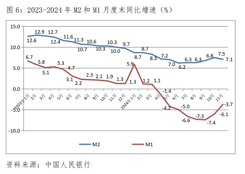 (四)M2增速由升轉落。11月末,廣義貨幣供應量(M2)同比增長7.1%,比10月末增長7.5%回落0.4個百分點,10月末增速比9月末增速回升0.7個百分點;狹義貨幣供應量(M1)降幅繼續(xù)縮小,11月末同比下降3.7%,比10月末同比下降6.1%縮小2.4個百分點,10月末降幅比9月末降幅縮小1.3個百分點;流通中貨幣(M0)增速由升轉落,11月末同比增長12.7%,比10月末增長12.8%回落0.1介百分點,10月末增速比9月末增速回升了1.3個百分點。各層次貨幣供應量又出現了不同方向的變化走勢。