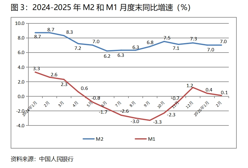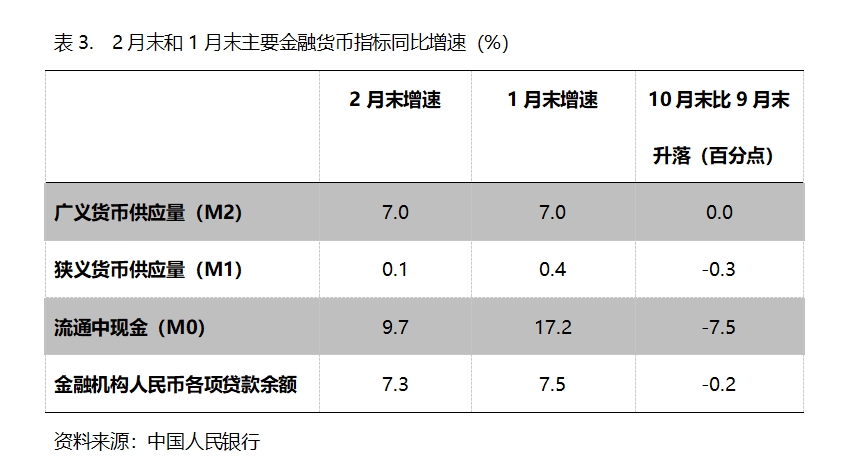 (三)M2增速由落轉(zhuǎn)平。2月末,廣義貨幣供應(yīng)量(M2)同比增長(zhǎng)7.0%,與1月末增長(zhǎng)7.0%持平,1月末增速比上年12月末增速回落了0.3個(gè)百分點(diǎn);狹義貨幣供應(yīng)量(M1)增速持續(xù)回落,2月末同比增長(zhǎng)0.1%,比1月末增長(zhǎng)0.4%回落0.3個(gè)百分點(diǎn),而1月末增幅比上年12月末增幅回落0.8個(gè)百分點(diǎn);流通中貨幣(M0)增速由升轉(zhuǎn)落,2月末同比增長(zhǎng)9.7%,比1月末增長(zhǎng)17.2%回落了7.5個(gè)百分點(diǎn),而1月末增速比上年12月末增速回升了4.2個(gè)百分點(diǎn)。按照貨幣政策適度寬松的要求,貨幣供應(yīng)量增速存在著提速的必要。