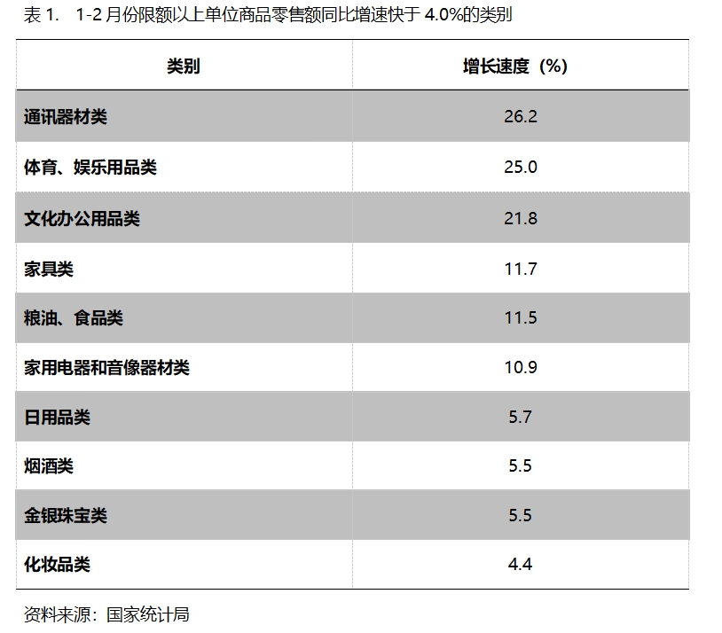 1-2月份,限額以上單位商品零售額增速快于社會(huì)消費(fèi)品零售總額4.0%增速的共有10類,即通訊器材類增長(zhǎng)26.2%,體育、娛樂用品類增長(zhǎng)25.0%,文化辦公用品類增長(zhǎng)21.8%,家具類增長(zhǎng)11.7%,糧油、食品類增長(zhǎng)11.5%,家用電器和音像器材類增長(zhǎng)10.9%,日用品類增長(zhǎng)5.7%,煙酒類增長(zhǎng)5.5%,金銀珠寶類增長(zhǎng)5.5%,化妝品類同比增長(zhǎng)4.4%。
