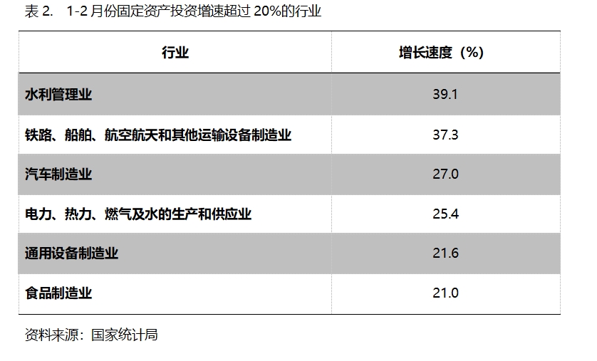 1-2月份,固定資產(chǎn)投資增速超過20%的主要行業(yè)共6個(gè),即水利管理業(yè)增長(zhǎng)39.1%,鐵路、船舶、航空航天和其他運(yùn)輸設(shè)備制造業(yè)增長(zhǎng)37.3%,汽車制造業(yè)增長(zhǎng)27.0%,電力、熱力、燃?xì)饧八纳a(chǎn)和供應(yīng)業(yè)增長(zhǎng)25.4%,通用設(shè)備制造業(yè)增長(zhǎng)21.6%,食品制造業(yè)增長(zhǎng)21.0%。