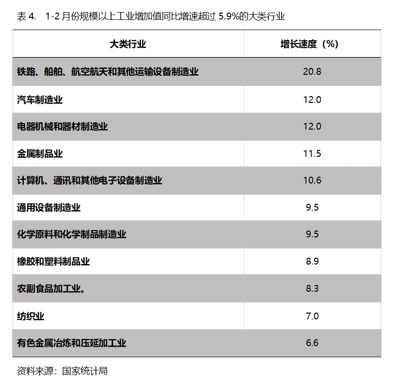 1-2月份,增長(zhǎng)速度超過規(guī)模以上工業(yè)增長(zhǎng)5.9%的主要大類行業(yè)共有11個(gè),即鐵路、船舶、航空航天和其他運(yùn)輸設(shè)備制造業(yè)增長(zhǎng)20.8%,汽車制造業(yè)增長(zhǎng)12.0%,電器機(jī)械和器材制造業(yè)增長(zhǎng)12.0%,金屬制品業(yè)增長(zhǎng)11.5%,計(jì)算機(jī)、通訊和其他電子設(shè)備制造業(yè)增長(zhǎng)10.6%,通用設(shè)備制造業(yè)增長(zhǎng)9.5%,化學(xué)原料和化學(xué)制品制造業(yè)增長(zhǎng)9.5%,橡膠和塑料制品業(yè)增長(zhǎng)8.9%,農(nóng)副食品加工業(yè)增長(zhǎng)8.3%,紡織業(yè)增長(zhǎng)7.0%,有色金屬冶煉和壓延加工業(yè)增長(zhǎng)6.6%。