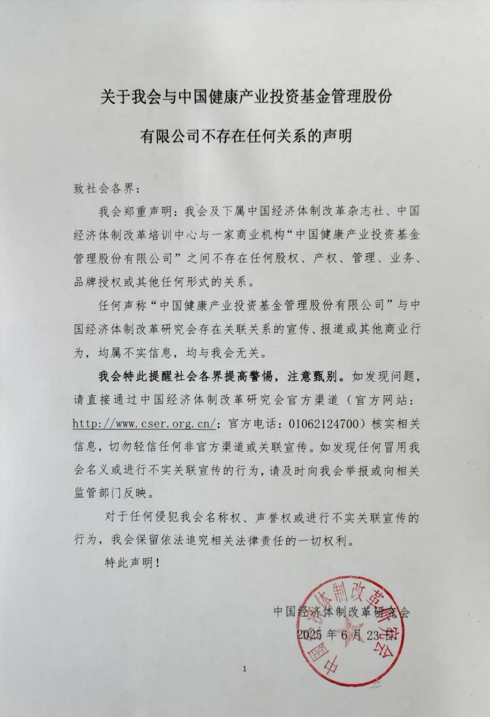 任何聲稱“中國健康產(chǎn)業(yè)投資基金管理股份有限公司”與中國經(jīng)濟(jì)體制改革研究會(huì)存在關(guān)聯(lián)關(guān)系的宣傳、報(bào)道或其他商業(yè)行為,均屬不實(shí)信息,均與我會(huì)無關(guān)。